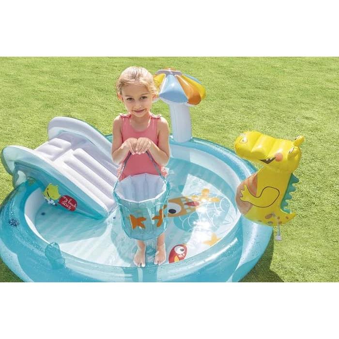 Ils pataugeront dans l’eau et se raconteront des histoires avec les accessoires gonflables fournis avec cette superbe aire de jeux (une bouée canard et un seau).