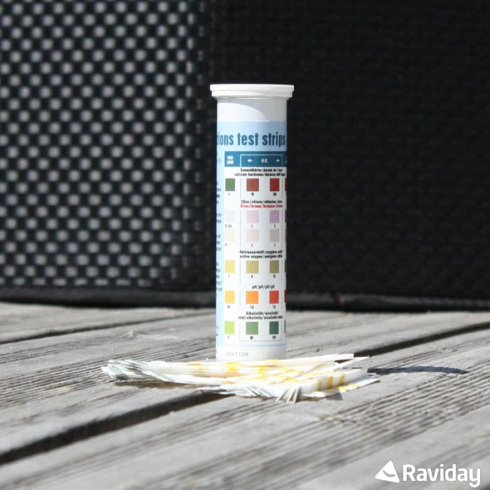Les bandelettes d‘analyse permettent de mesurer le pH, le chlore/brome, l’oxygène actif, l’alcalinité ainsi que la dureté de l’eau du spa.