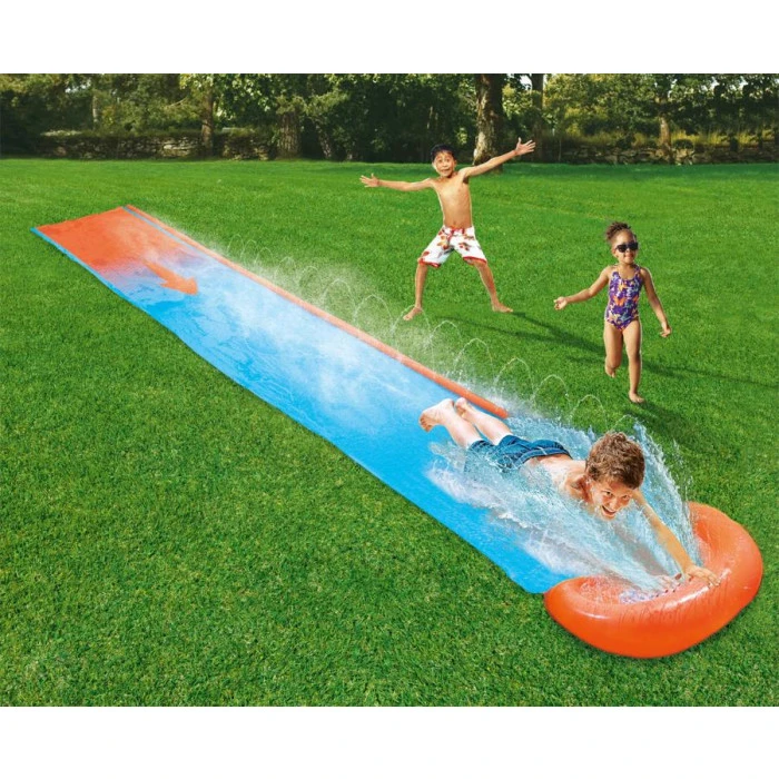 Raccordez simplement ce tapis à votre tuyau d’arrosage et votre enfant pourra se lancer sur une piste de presque 5 mètres.